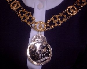 The Badge of Office is worn either on the official Mayoral chain - which is 18ct gold, 44 inches in length, shaped and pierced long oval links with "H" and round medallions with pierced hare centres and laurel wreath borders, or on a plain ribbon - either red or black.